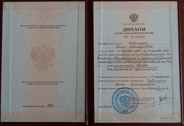 В 2005 году прошла профессиональную переподготовку на факультете повышения квалификации и профессиональной переподготовки работников образования Омского государственного педагогического университета.